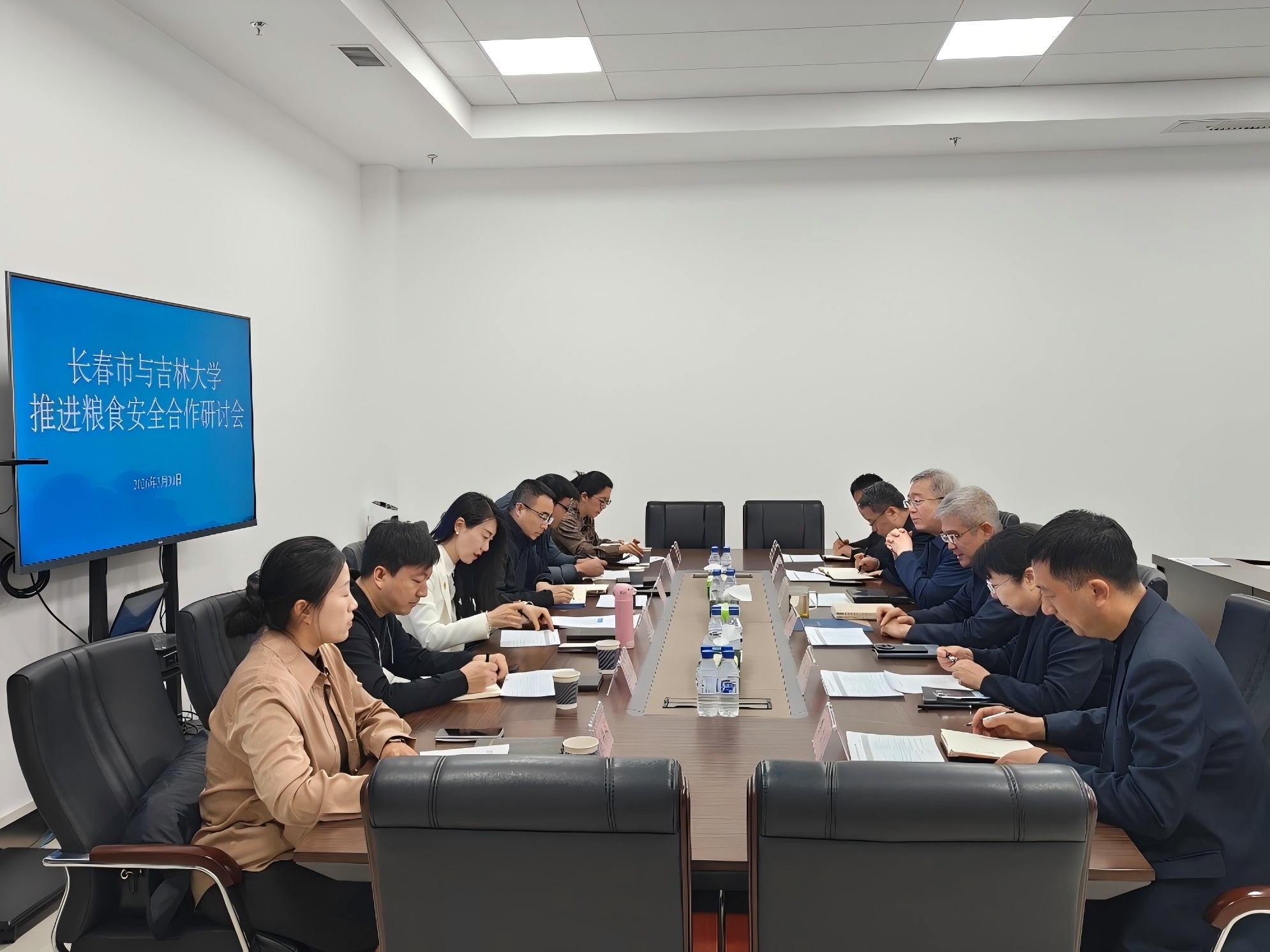 为深入贯彻落实习近平总书记在听取吉林省委和省政府工作汇报时的重要讲话精神,进一步加强国家安全学科建设,拓展学科服务区域发展能力,2026年3月30日,公共外交学院、国家发展与安全研究院院长肖晞率队赴长春市粮储局,共同召开推进粮食安全合作研讨会。长春市粮储局党组书记、局长卢天恒主持会议。